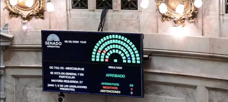 El Senado de la Nación aprobó por 69 votos a favor y 3 en contra el acuerdo Unión Europea-Mercosur. Luego de cuatro horas de debate en donde los senadores de La Libertad Avanza tuvieron una baja participación, el peronismo fue pasando uno a uno sus legisladores señalando el apoyo pero con críticas al Gobierno nacional, su política en lo referente a los tratados internacionales y a su política económica.
